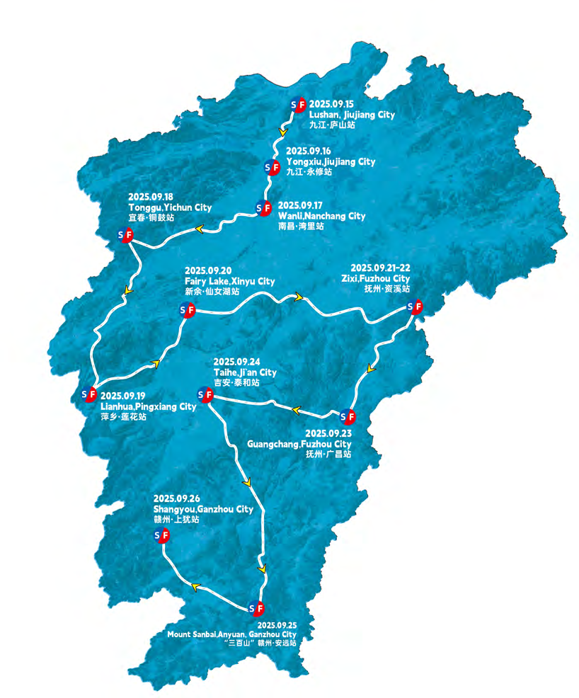 大赛历时11天,途经九江庐山、九江永修、南昌湾里、宜春铜鼓、萍乡莲花、新余仙女湖、抚州资溪、抚州广昌、吉安泰和、赣州安远、赣州上犹,11个赛站全部纳入国际自盟亚洲巡回赛序列。赛事总里程高达3027.3公里,其中比赛距离1061.3公里,转场距离1966公里,11个赛站共设置25个途中冲刺点、12个爬坡点。不仅是全亚洲本年度赛事站点最多、总里程最长的职业公路自行车比赛,也是江西体育在国际化、专业化上实现新突破的重要体现。