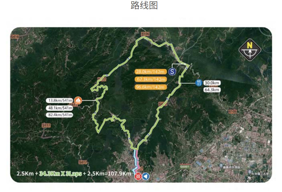 9月17日上午九点,爬坡绕圈赛在南昌湾里梅岭打响。本赛段全程107.9公里,进行3圈绕圈赛。赛道途中设有三个冲刺点,分别位于28公里、62.3公里和96.6公里处。同时还有三个一级爬坡点。完成三圈绕行后,车手们的累计爬升高度将达到1600以上。